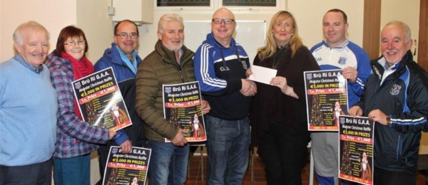Lelia Beechinor, Beechinor's O'Rourke's Cross, presenting a sponsorship cheque for first prize in the Bruree GAA Monster Christmas Raffle to Frankie Finn, Bruree GAA Finance Committee with club officers Johnny Wall, Kit O'Halloran, Liam Hogan, Noel Brosnan, Eamon Sexton and Jimmy Feane.